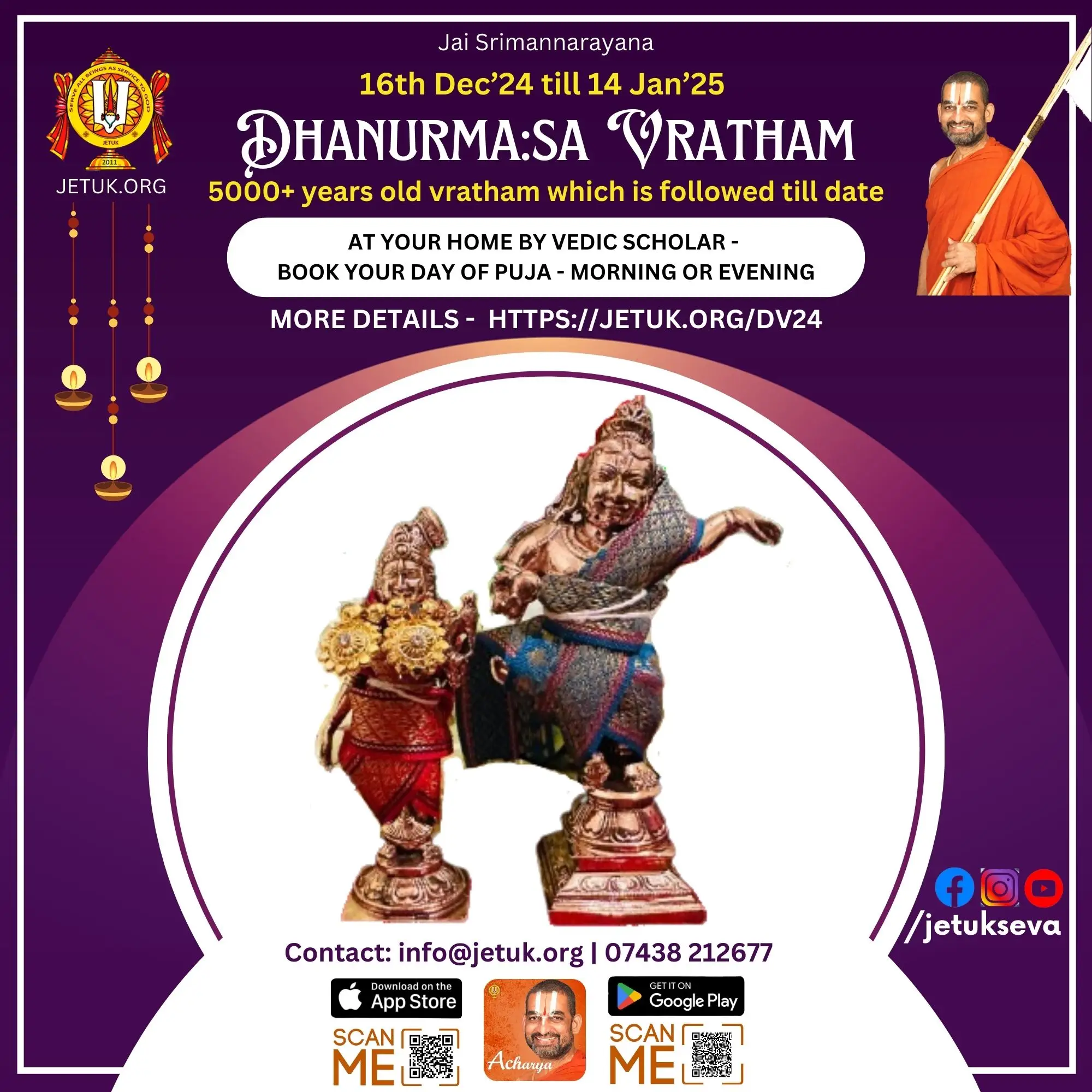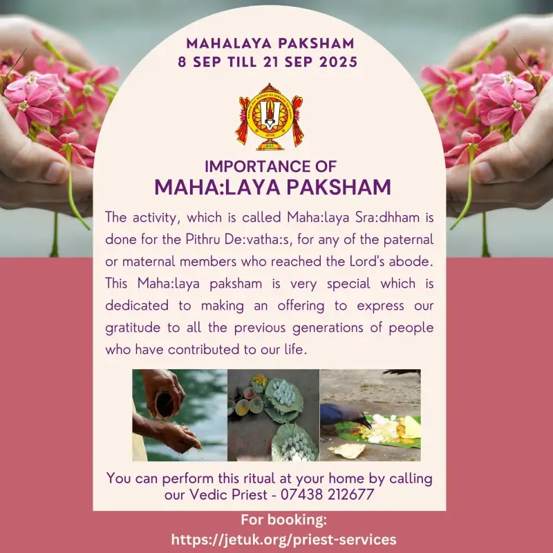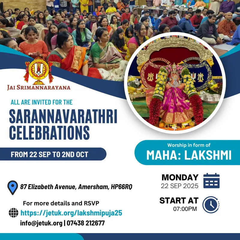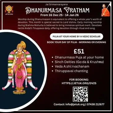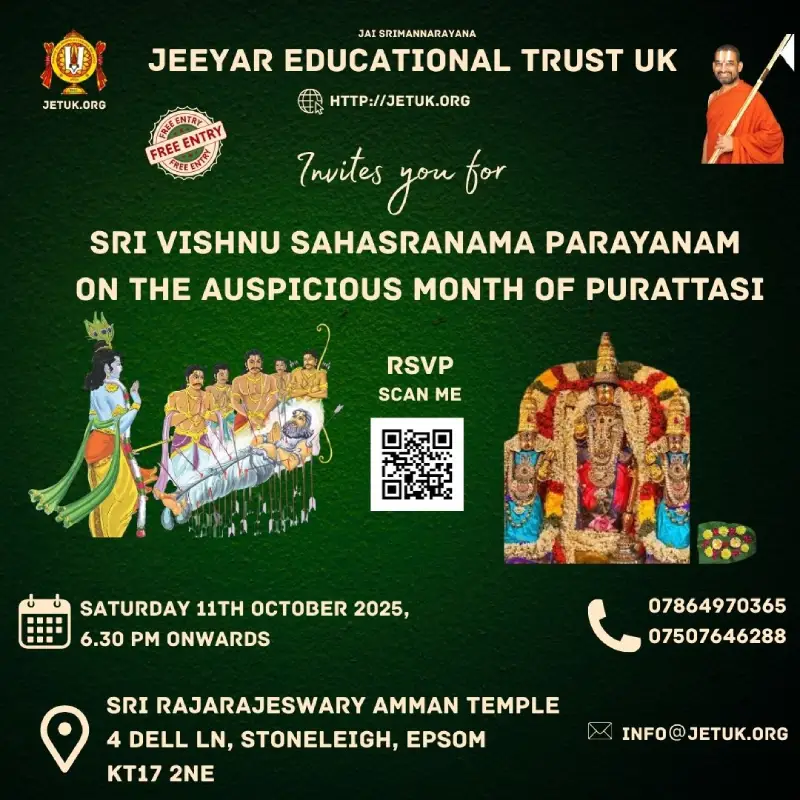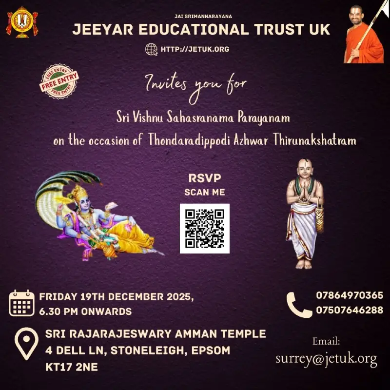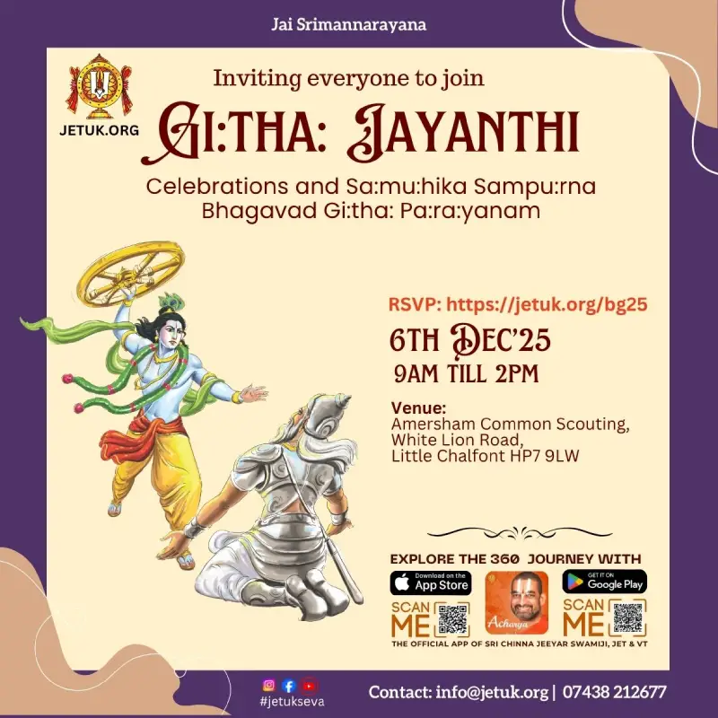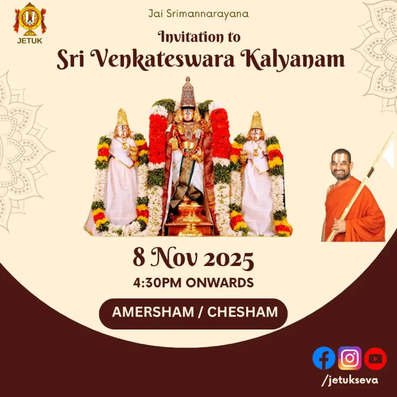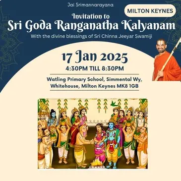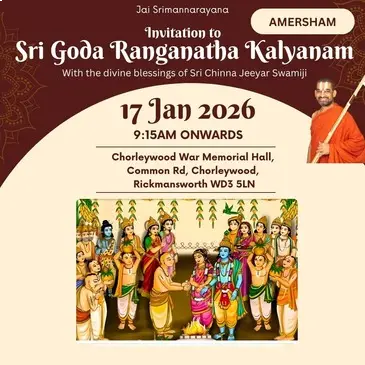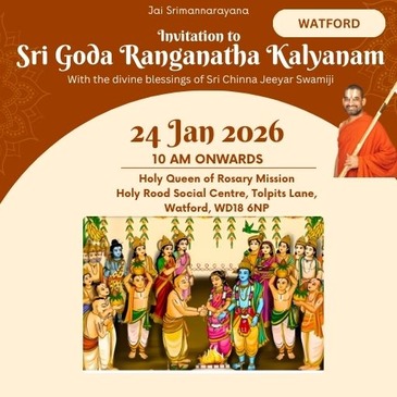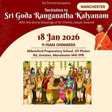 EventsUpcoming EventsCompleted EventsUpcoming Events HH Visit 2025 – Sponsorship Opportunities April 12, 2025 Read More 16 Dec’25 – Dhanurma:sa Vratham or Ma:rgazhi or Ma:rgali Starting November 26, 2025 Read More 19 Dec 2025 – Sri Vishnu Sahasranamam Chanting – Epsom November 27, 2025 Read More 11 Jan 2026 (Morning) – Sri Goda Ranganatha Kalyanam @ Stoneleigh November 28, 2025 Read More 17 Jan 2026 (Morning) – Sri Goda Ranganatha Kalyanam @ Amersham November 29, 2025 Read More 17 Jan 2026 (Evening) – Sri Goda Ranganatha Kalyanam @ Milton Keynes November 29, 2025 Read More 18 Jan 2026(Morning) – Sri Goda Ranganatha Kalyanam @ Manchester November 29, 2025 Read More 18 Jan 2026(Evening) – Sri Goda Ranganaatha Kalyanam @ Chester November 29, 2025 Read More 24 Jan 2026 (Morning) – Sri Goda Ranganatha Kalyanam @ Watford November 29, 2025 Read More 24 Jan 2026 (Evening) – Sri Goda Ranganatha Kalyanam @ Slough November 29, 2025 Read More 25 Jan 2026 (Morning) – Sri Goda Ranganatha Kalyanam @ Southend On Sea November 29, 2025 Read More 25 Jan 2026 (Evening) – Sri Goda Ranganatha Kalyanam @ East London November 29, 2025 Read More 12 12Completed Events 8 Sep till 21 Sep 2025 – Mahalaya Paksham August 31, 2025 0 Read More 11 Oct 2025 – Sri Vishnu Sahasranamam Chanting September 27, 2025 Read More Sarannavarathri Celebrations 2025 August 13, 2025 Read More HH 69th Thirunakshathram Celebrations October 16, 2025 Read More 8 Nov 2025 – Sri Venkateswara Kalyanam @ Amersham/Chesham October 16, 2025 Read More 9 Nov 2025 – Men’s Doubles Badminton Tournament @ Manchester September 24, 2025 0 Read More 22 Nov 2025 – Badminton Tournament @ Slough September 29, 2025 Read More 29 Nov 2025 – Sampu:rna Bhagavad Gi:tha: Pa:ra:yanam @ Chester November 8, 2025 Read More 6 Dec 2025 – Sampu:rna Bhagavad Gi:tha: Pa:ra:yanam @ Amersham November 10, 2025 Read More 16 Dec’24 – Dhanurma:sa Vratham or Ma:rgazhi or Ma:rgali Starting December 10, 2024 Read More 15 Sep 2025 – Krushnashtami Celebrations September 12, 2025 Read More 19 Sep 2025 – Friday Lakshmi Puja and Sri Vishnu Sahasranamam Chanting September 12, 2025 Read More 123456789101112 123456789101112