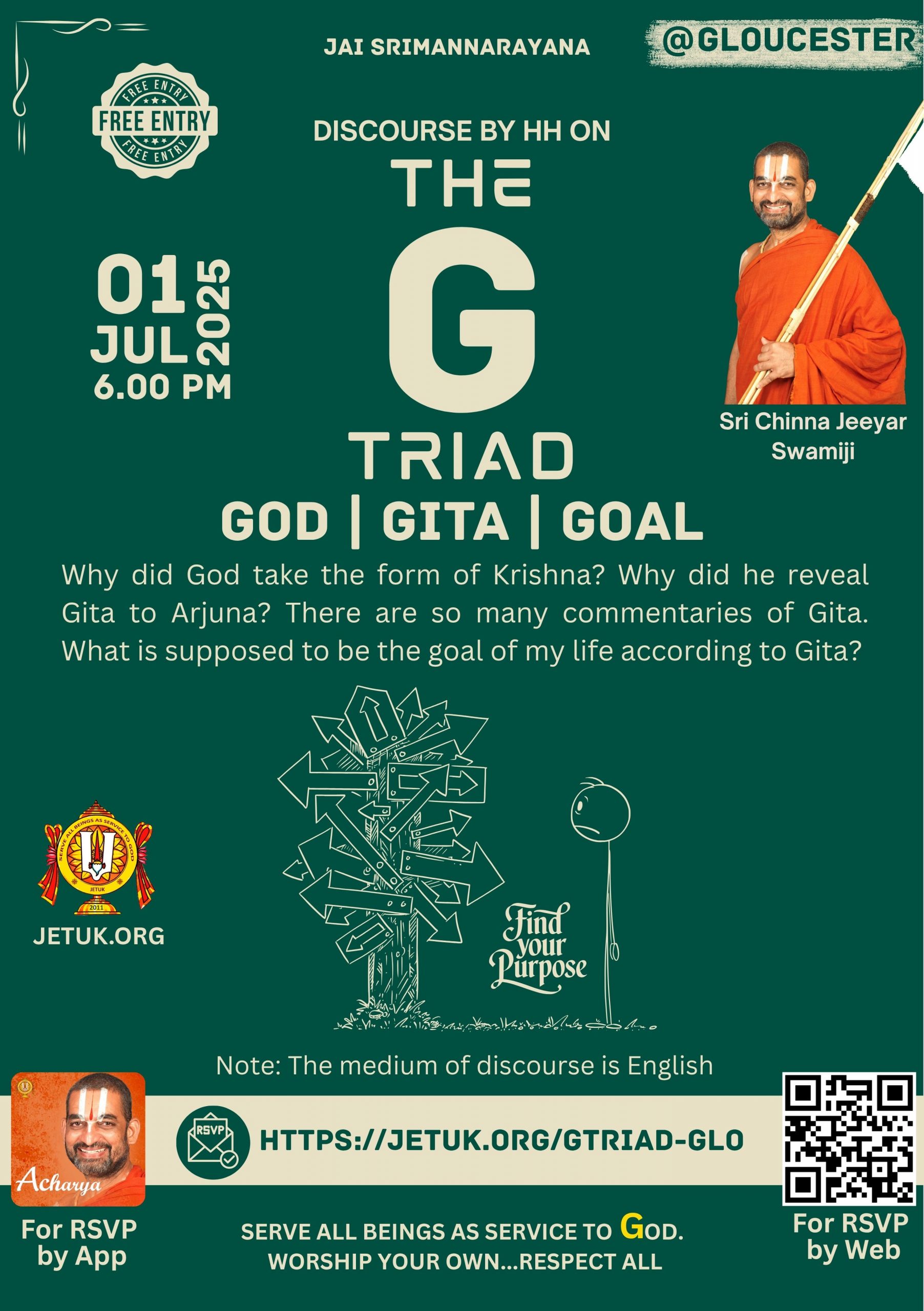 Join us for an enlightening session where Sri Chinna Jeeyar Swamiji will delve into the eternal wisdom of the Bhagavad Gita, explaining the essence of the Divine (GOD), the Path of Knowledge and Devotion (GITA), and the Ultimate Purpose of Life (GOAL).