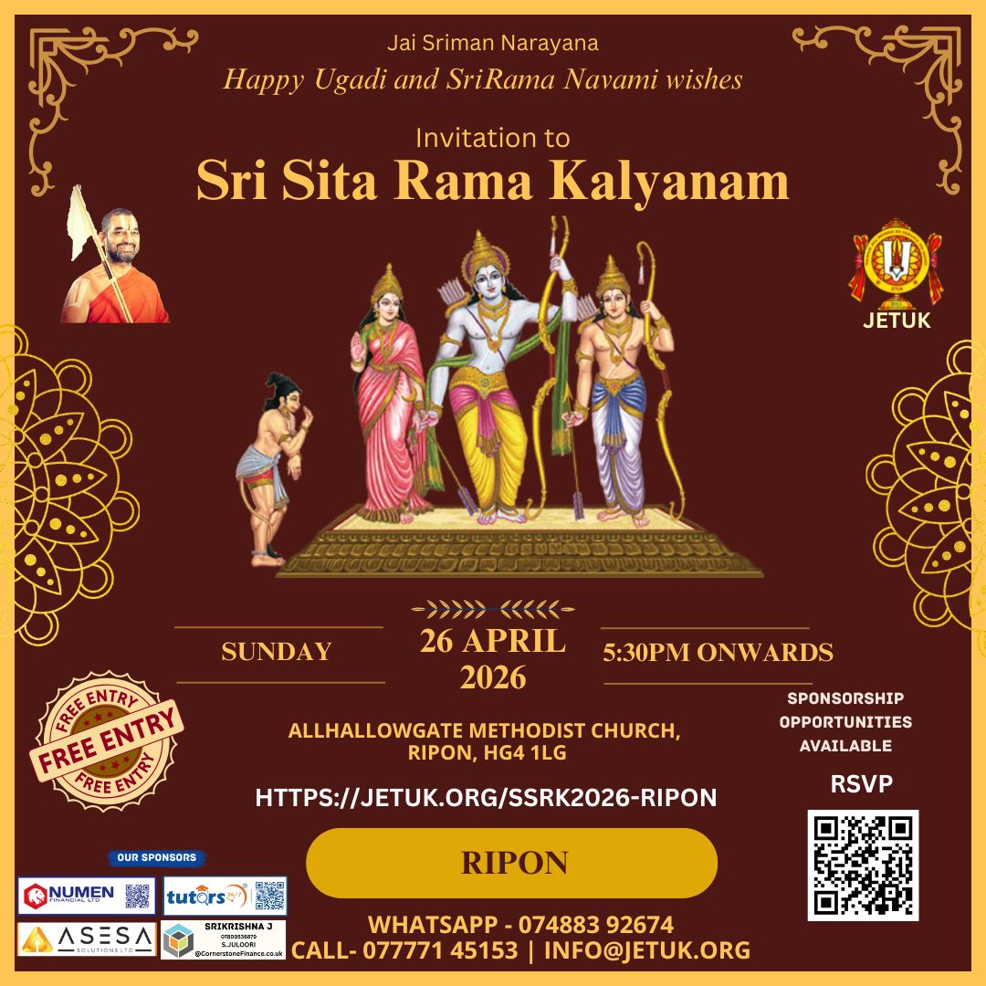 With immense joy and gratitude, JETUK is organising Sri Sita Rama Kalyanam. This is a rare and sacred opportunity for all devotees to be part of this divine celebration through various sevas.